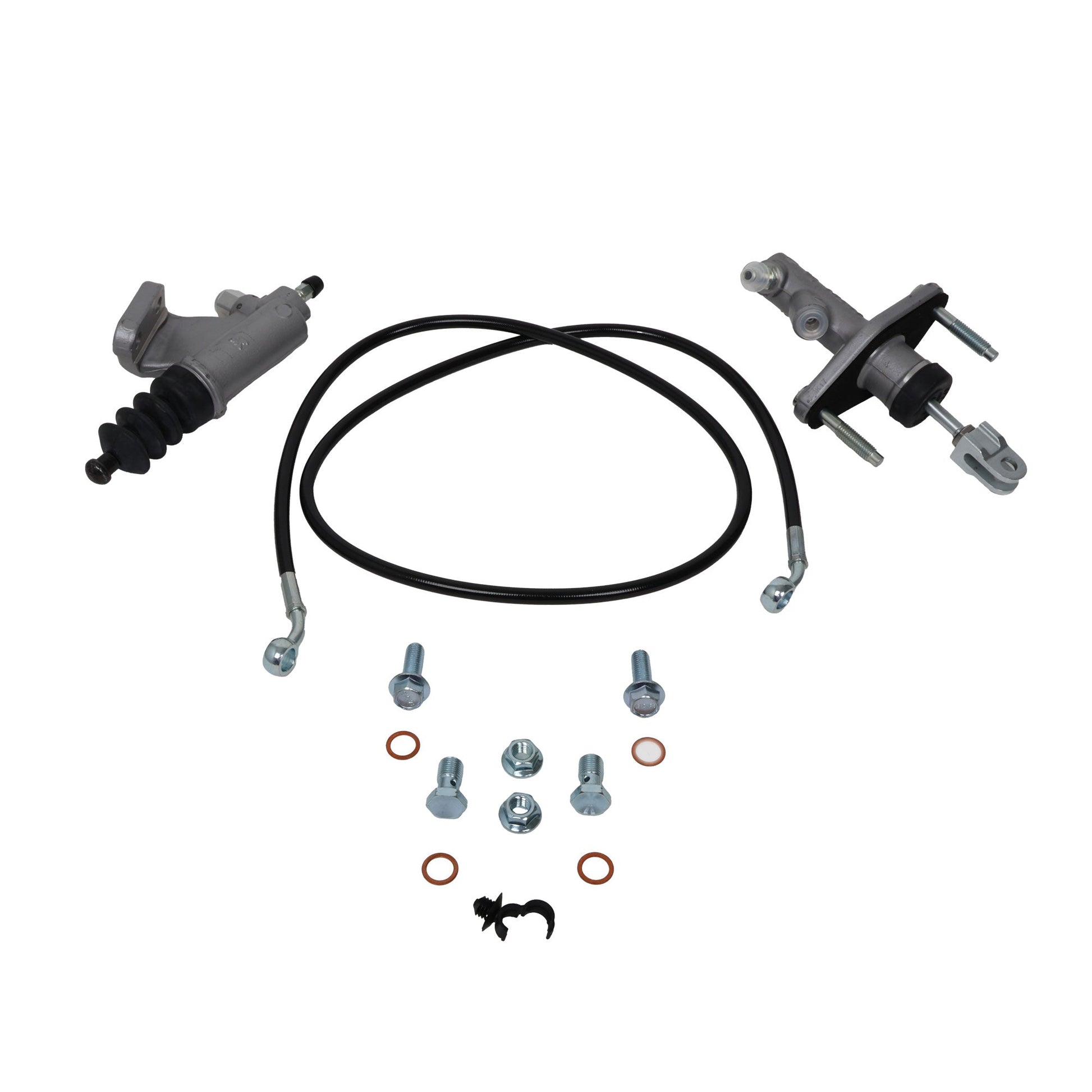 The Hybrid Racing Clutch Master Cylinder Upgrade kit for the 2004-2008 Acura TSX is a straightforward bolt-on part that includes an OE Nissin CMC, a stainless braided clutch line with fittings, and a stand-off for mounting the clutch line. No additional replacement parts or parts from the factory CMC are required. The kit has the necessary grease to lubricate the clevis pin and prevent NVH (noise, vibration, and harshness).