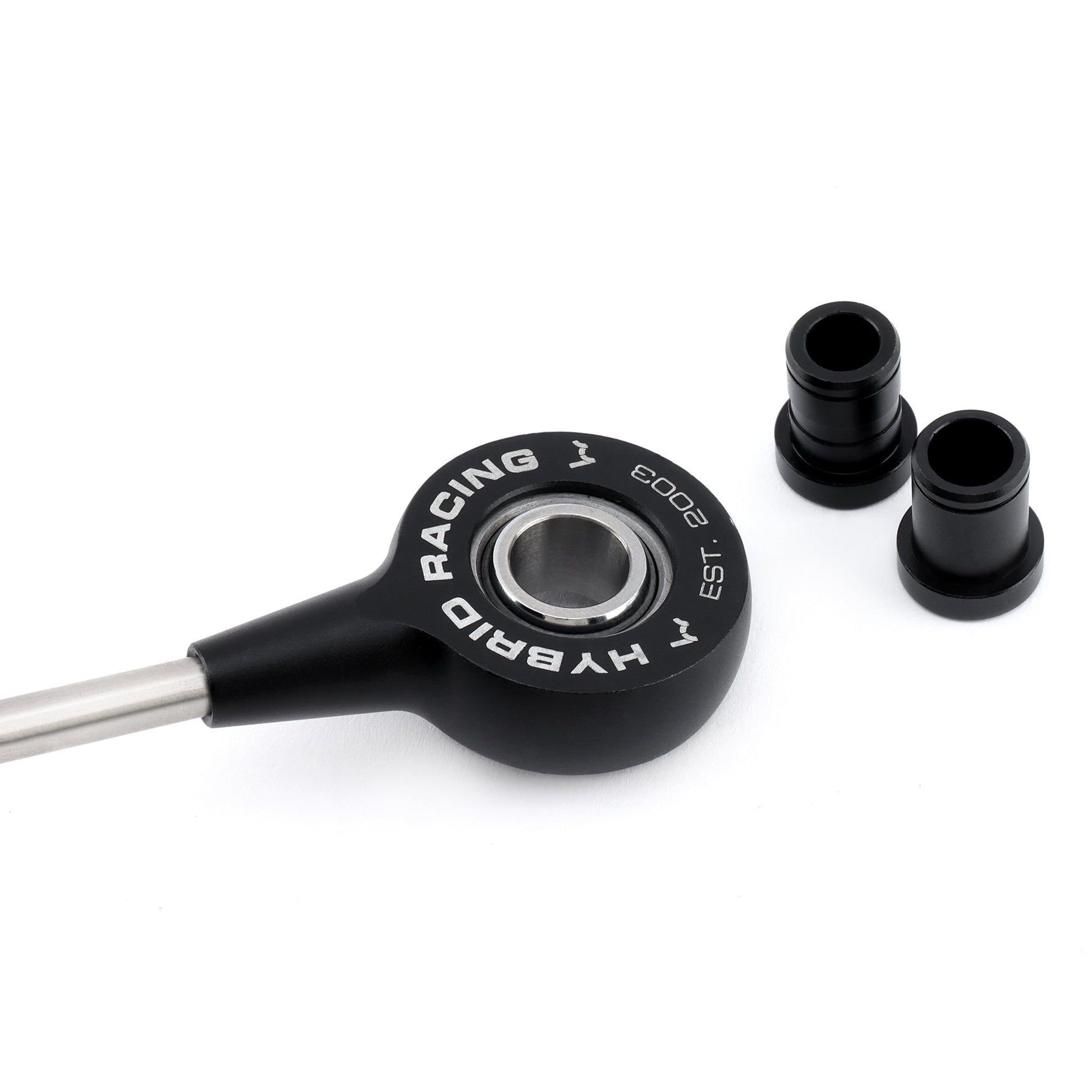 Other notable features of the Hybrid Racing cables are spherical bearings, stainless steel push rods, and upgraded stainless steel swivel support tubes (oem are plastic) that are known to break on the OEM cables. All of the rod ends, and mounting bushings are CNC machined 6061 aluminum then black anodized before being laser etched with the Hybrid Racing logo and flair.