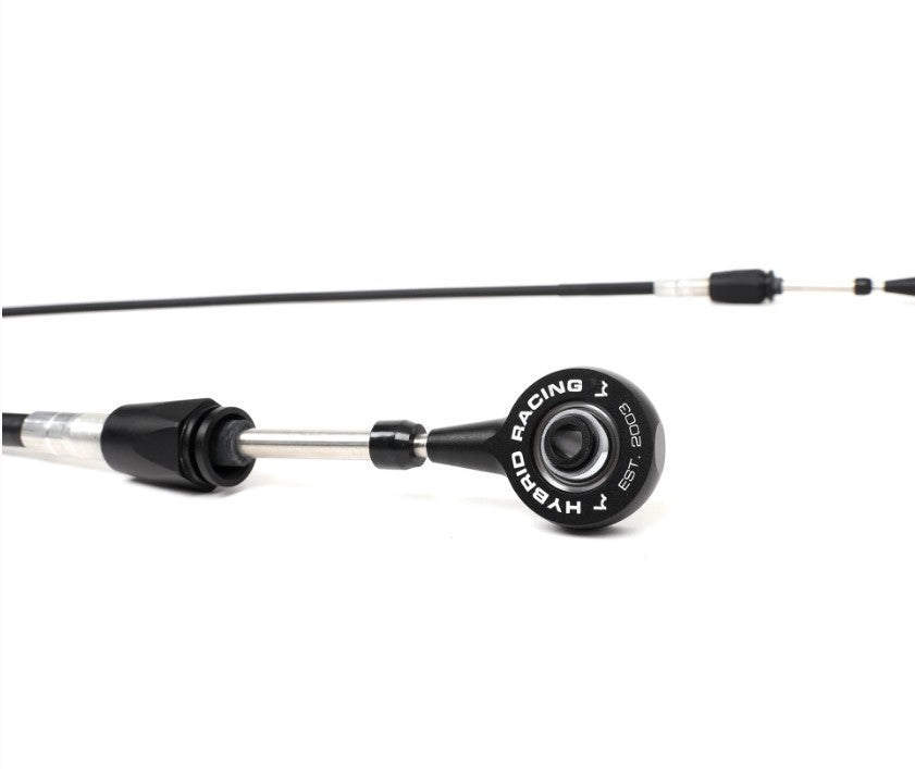 Hybrid Racing Shifter Cables feature CNC-machined 6061 aluminum end links, black anodized for durability and laser-etched with the Hybrid Racing logo. The cables incorporate permanently lubricated cores for smooth operation and heat-resistant sheathing capable of withstanding temperatures up to 225°F (107°C). Unlike factory cables, which use plastic swivel support tubes prone to failure, these upgraded cables utilize stainless steel support tubes for increased longevity and reliability.